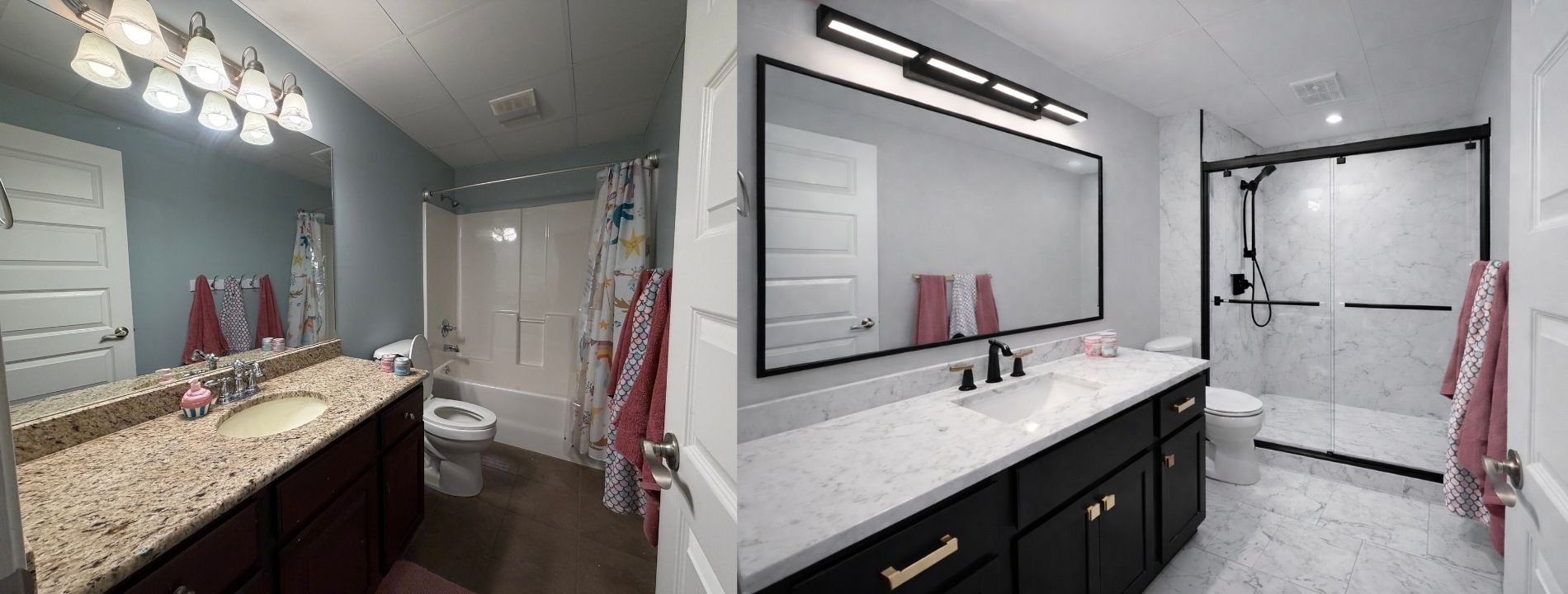 Asking ChatGPT to add a black vanity with carrara top, black and gold fixtures, carrara onyx shower with black sliding glass door, and white paint. Added links to specific box store products for specifics.